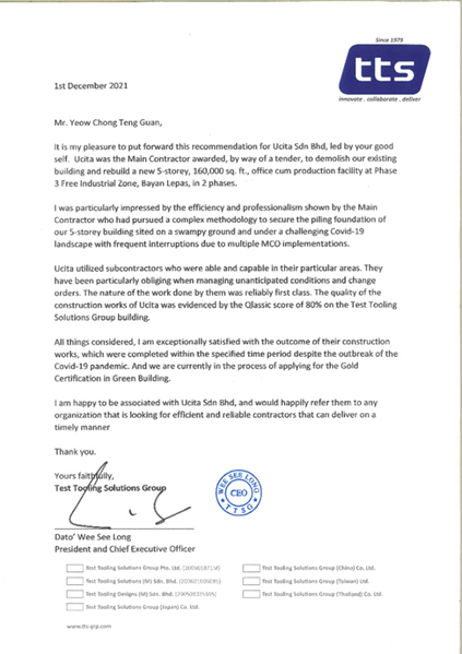 Ucita enjoys long-standing relationships with prominent developers such as IJM Land, Paramount Property, and DNP Land. Notably, in 2024, Ucita was honoured with the Best Contractors Award under the IJM Excellence Awards.